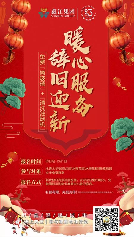 鑫江物業(yè)心疼業(yè)主們一年來的辛苦忙碌,更是回報(bào)您一直以來的支持與信賴。2月1日—2月11日,我們推出免費(fèi)“擦玻璃”和“清洗油煙機(jī)”暖心物業(yè)服務(wù),讓您解放雙手,放松心情,好好享受年底假期,高高興興過大年!