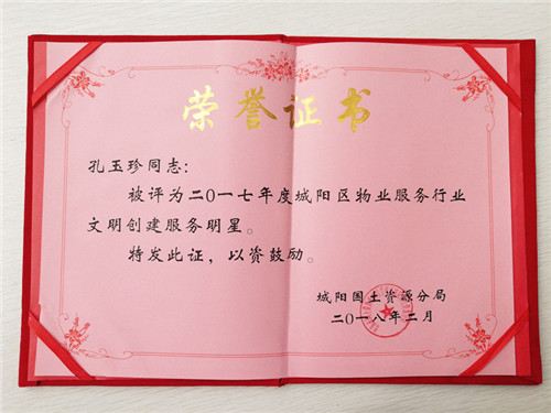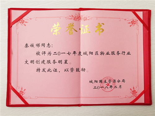 被評(píng)為“城陽(yáng)區(qū)物業(yè)服務(wù)行業(yè)文明創(chuàng)建服務(wù)明星”