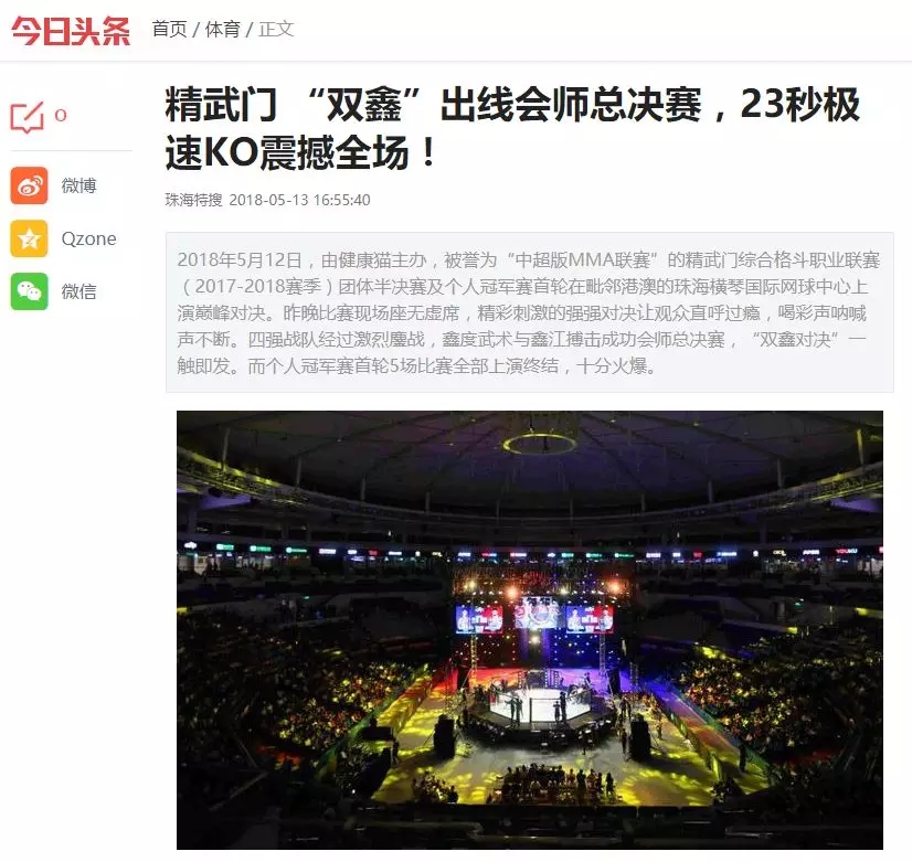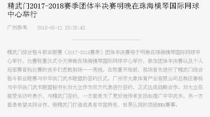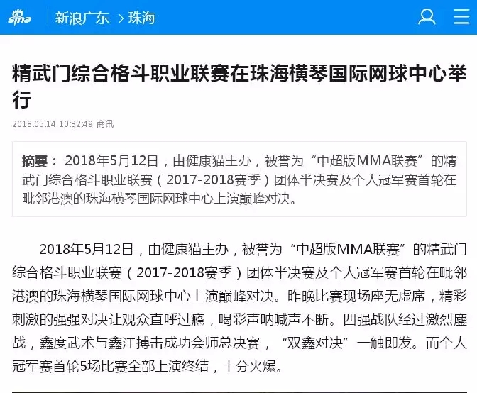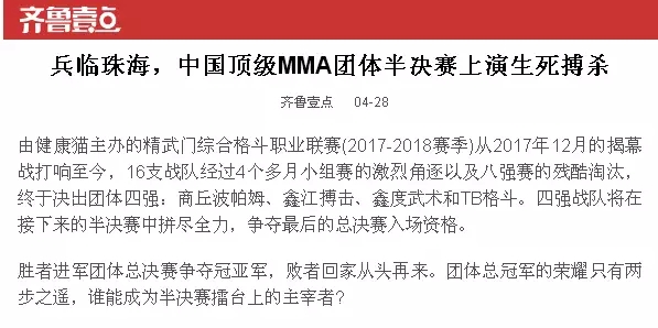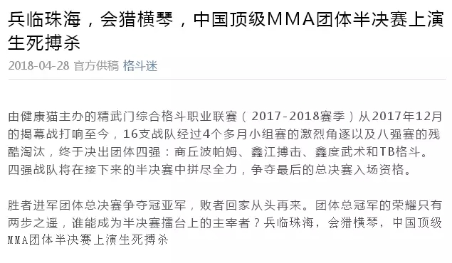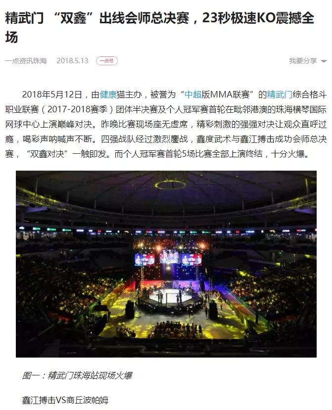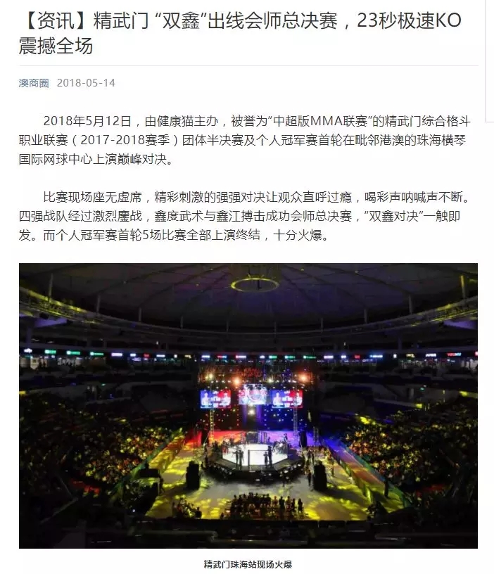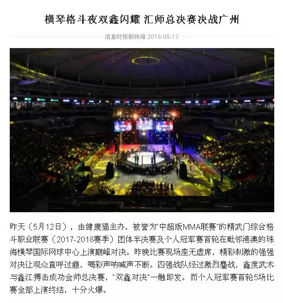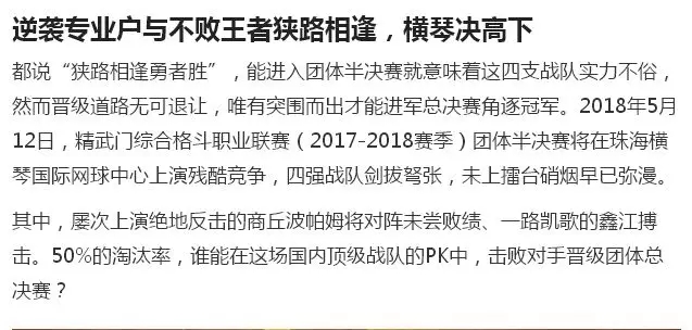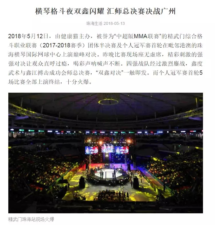 2018年5月12日,精武門(mén)綜合格斗職業(yè)聯(lián)賽(2017—2018賽季)團(tuán)體半決賽在珠海橫琴?lài)?guó)際網(wǎng)球中心圓滿(mǎn)落幕。鑫江搏擊3:2險(xiǎn)勝商丘波帕姆,成功拿到團(tuán)體總決賽的入場(chǎng)券。
