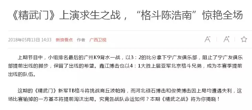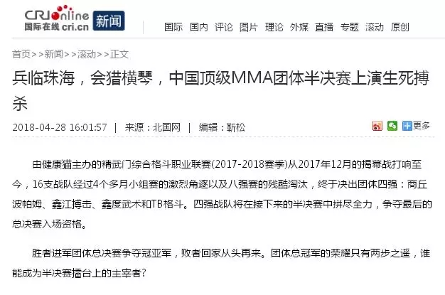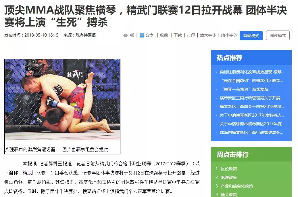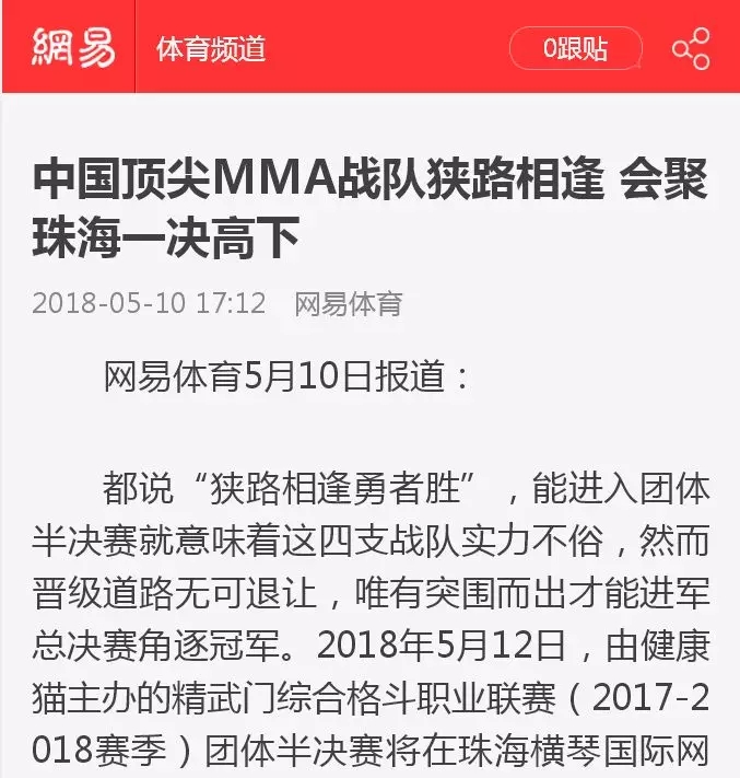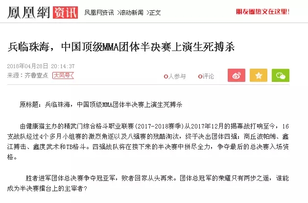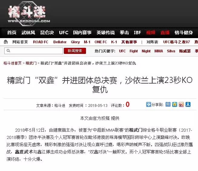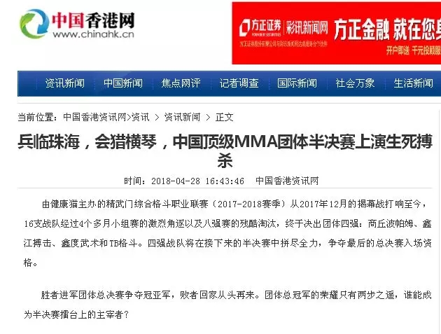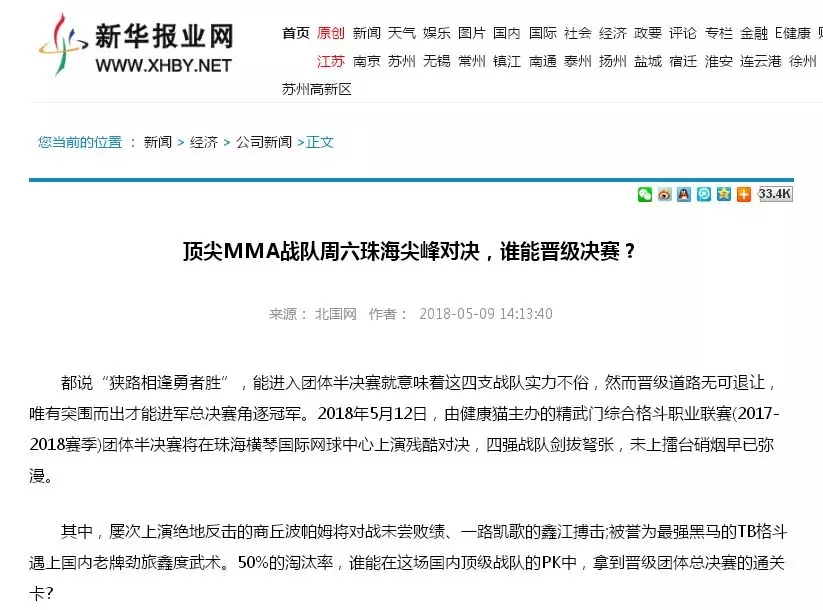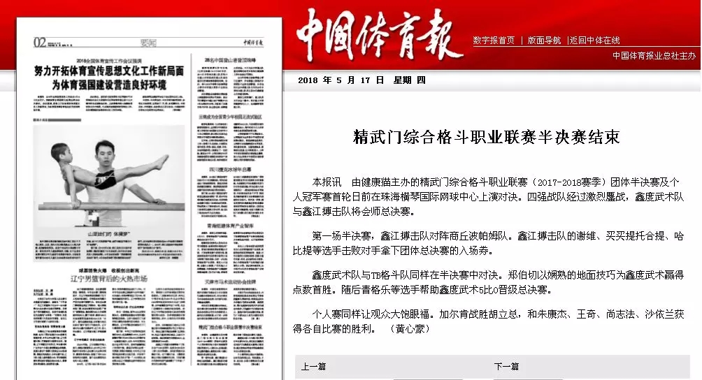 2018年5月12日,精武門(mén)綜合格斗職業(yè)聯(lián)賽(2017—2018賽季)團(tuán)體半決賽在珠海橫琴?lài)?guó)際網(wǎng)球中心圓滿(mǎn)落幕。鑫江搏擊3:2險(xiǎn)勝商丘波帕姆,成功拿到團(tuán)體總決賽的入場(chǎng)券。