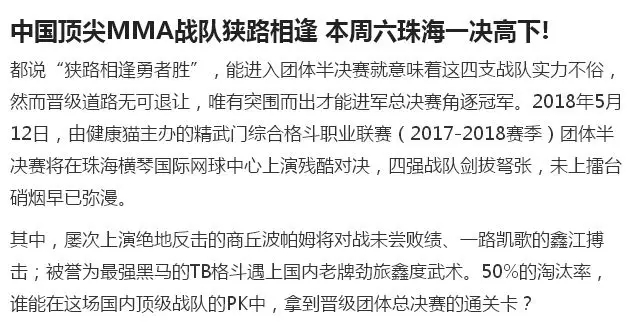 在這場(chǎng)國(guó)內(nèi)頂級(jí)戰(zhàn)隊(duì)的PK中,鑫江搏擊一路過(guò)關(guān)斬將,毫無(wú)保留的為拳迷獻(xiàn)上一場(chǎng)MMA比賽盛宴!