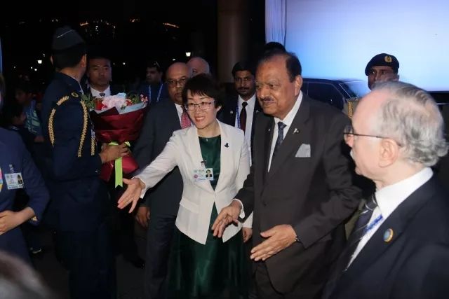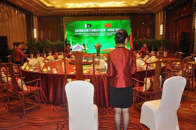 圖為酒店總經(jīng)理張曉東女士迎接巴基斯坦總統(tǒng)馬姆努恩·侯賽因(Mr.Mamnoon Hussain)