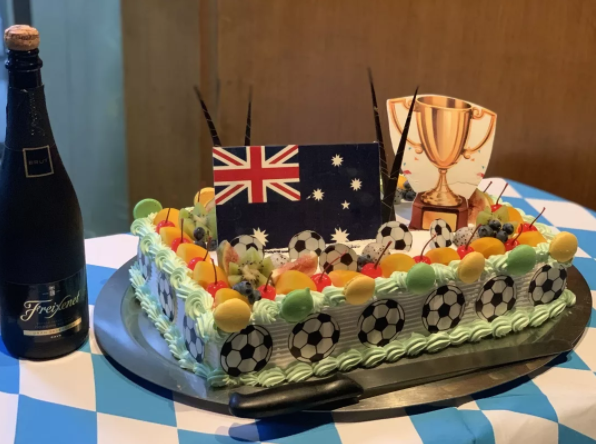 酒店還為球隊(duì)準(zhǔn)備了印有獎(jiǎng)杯、足球元素的蛋糕、和香檳,慶祝勝利。