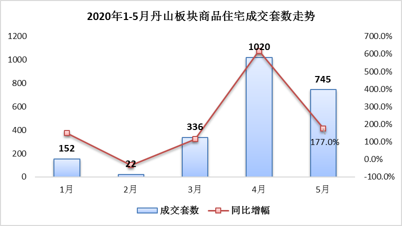 4月份,疫情期間主城區(qū)被壓抑的需求爆發(fā),帶動丹山版塊商品住宅成交套數高達到1020套,同比(比去年同期)增幅高達600%以上。5月份,成交規(guī)模雖有所減緩,但同比增幅仍在177%。
