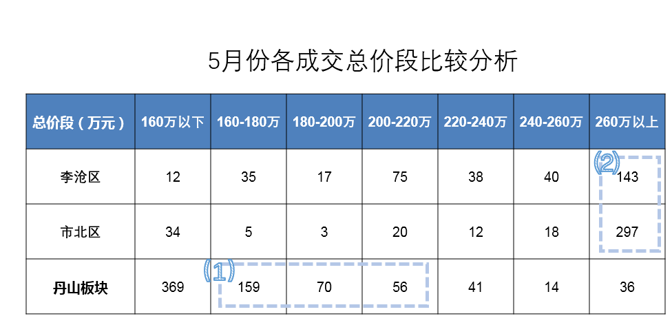 選擇丹山版塊的客群中,市區(qū)外溢的改善型需求是主力之一。從總價段比較分析來看(下圖),丹山版塊在160-220萬元三個總價段成交比較集中,是改善型需求的主力價格段(如1所示),而市北、李滄的改善需求成交主力都在260萬元以上,甚至更高(如2所示)。