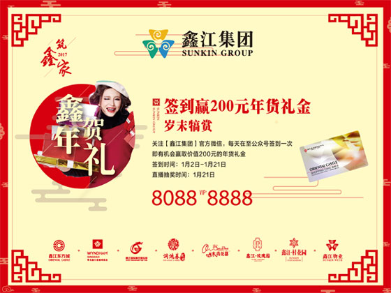 1月2日-1月21日,關(guān)注【鑫江集團(tuán)】微信公眾號(hào),在線報(bào)名申請(qǐng)年貨禮金,期間累計(jì)簽到十次,即有機(jī)會(huì)免費(fèi)參與1月21日,禮金直播抽獎(jiǎng),現(xiàn)場(chǎng)抽出200位獲獎(jiǎng)粉絲,每位送出200元年貨禮金!