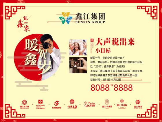 1月1日-1月12日,拍攝小視頻,說出你的新年小目標(biāo),以“2017,鑫年快樂“為結(jié)尾,上傳至【鑫江集團(tuán)】或【鑫江東方城】微信公眾號(hào),即可免費(fèi)領(lǐng)取新年禮包一份,同時(shí),1月21日-27日,【青島東方城】微信公眾號(hào),將開啟在線有獎(jiǎng)轉(zhuǎn)發(fā),轉(zhuǎn)發(fā)視頻圖文至朋友圈,即可免費(fèi)領(lǐng)取新年好禮一份。